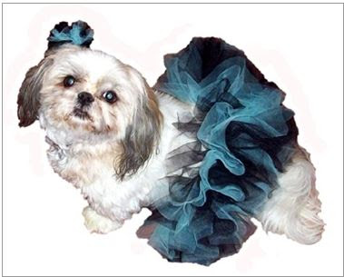 · Dress your little one up with this simple and elegant Classic Dog Tutu in Aqua and Black ($25). Made with yards and yards of puffy tulle, these tutus have a gap under the belly to prevent soiling. The material can be slid to either side to adjust the gap. Sizes range from double extra-small to triple extra-large. You can top her new tutu with a matching hair bow for an additional $10.