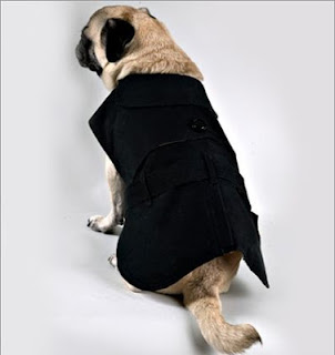 For example, this Trench Coat ($86) first dogs with lengths from 8-16 inches and girths from 14-26 inches. Made with heavy weight black cotton canvas and lined with a blue and tan multi dot print, this water resistant garment comes with a removable belt.