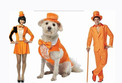 Take a look at this Lloyd Tux Dog Costume from the movie “Dumb & Dumber.” The orange dog tuxedo costume ($35) includes a jacket with attached shirt and tie plus a top hat. Pet sizes range from extra small to triple extra-large. Women can get a matching costume for $85 while the men’s version is $95. The human costumes do not include wigs or shoes. Check our online listing for details on the human costume components.