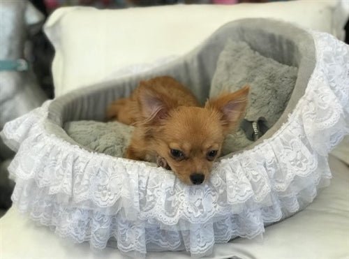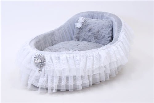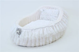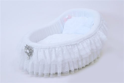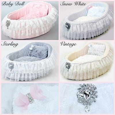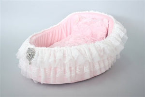 For that beautiful addition to your family, you'll want your pup to have sweet beginnings in our adorable Crib bed, to lull your baby into sweet dreams. Trimmed in two-tiered romantic handmade lace, our cribs also feature a bouquet drop crystal brooch and removable pillow for easy care. You'll be the envy of all your friends! Our collection offers three soft colors to choose from.