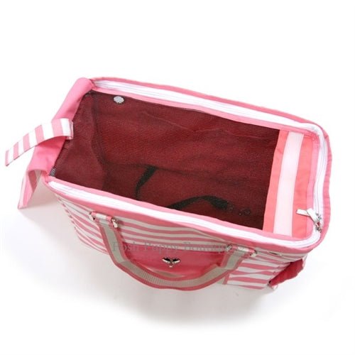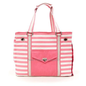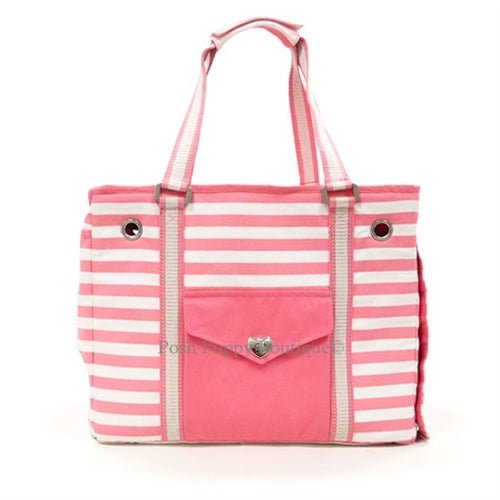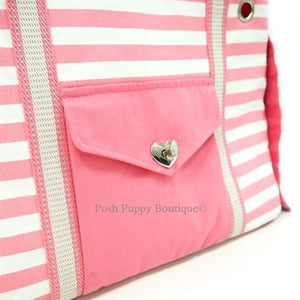 Pink striped canvas collapsible tote with dual strap design, functional pocket on each side, front pocket heart-shaped metal hardware closure, inner compartmental pockets, zipper mesh window with cover over the top, rolled up cover on the side, and an inner security leash included.