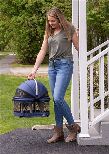 The VIEW 360 pet carrier is the easiest way to transport your pet in comfort and style. It easily converts into a car seat by attaching to your vehicle’s seat belt in seconds, no tools required. A push button entry is located on each side of the carrier giving you easy access to your pet without fumbling with difficult zippers. The carrier features mesh ventilation all the way around so your pet won’t miss any views while you travel. A removable, washable pad and interior tether are included to keep your pet comfortable and secure. The carrier is lightweight and has a padded carry handle to make traveling with your pet a breeze.