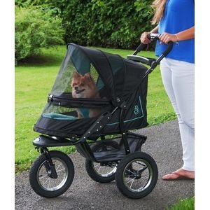 This stroller navigates over rough terrain with ease, whether jogging or strolling, thanks to the front locking wheel. Speaking of strolling, the new panoramic view window allows your pet to remain safe inside of the stroller without missing any sights along the way. This stroller also features a plush bolster pad, air tires for a smoother ride, and new stylish colors and embroidery, what more could a pet want!