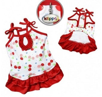 Adorable and soft knit cotton sundress with cherries pattern. Accented with ruffles and shoulder ties - for easy length adjustments. A small D-Ring attached near the neck area to add on a "Klippo" charm or ID tag!