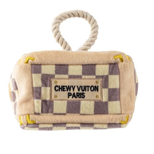 New to the Chewy Vuiton Collection! We present the Checker Chewy Vuiton Trunk, an activity house to keep your pups busy for hours of fun!Our Chewy Vuiton Trunk is sure to keep your pup busy and engaged! Includes three Checker Chewy Vuiton Balls that squeak AND crackle! You dog will have a "ball" trying to remove the balls from inside the trunk. Measures 7 x 6 x 5.5 inches. Balls measure 2.5 inch diameter.