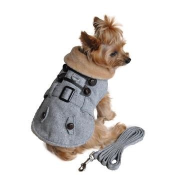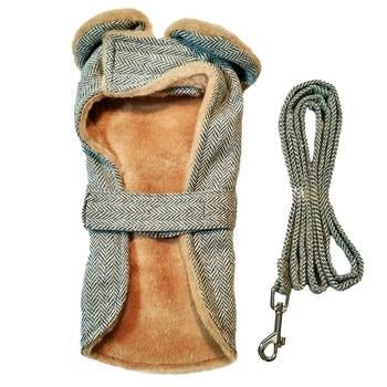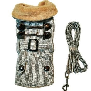 Our new Grey Herringbone coat is made of a wool and polyester blend. This fashionable coat also features a faux fur collar and lining as well as a sewn-in D-ring (sizes XS-Large) for easy walking. Extra-Large and 2X-Large feature leash access holes. All sizes include a matching leash.