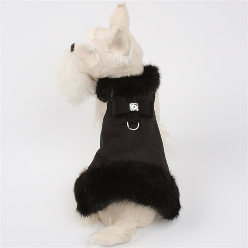 This plush faux fur accents our Luxe Suede coat with Chenille lining is accented with a Big Bow embellishment and a “D” ring for attaching a leash. Lastly, this coat is manufactured in the USA.