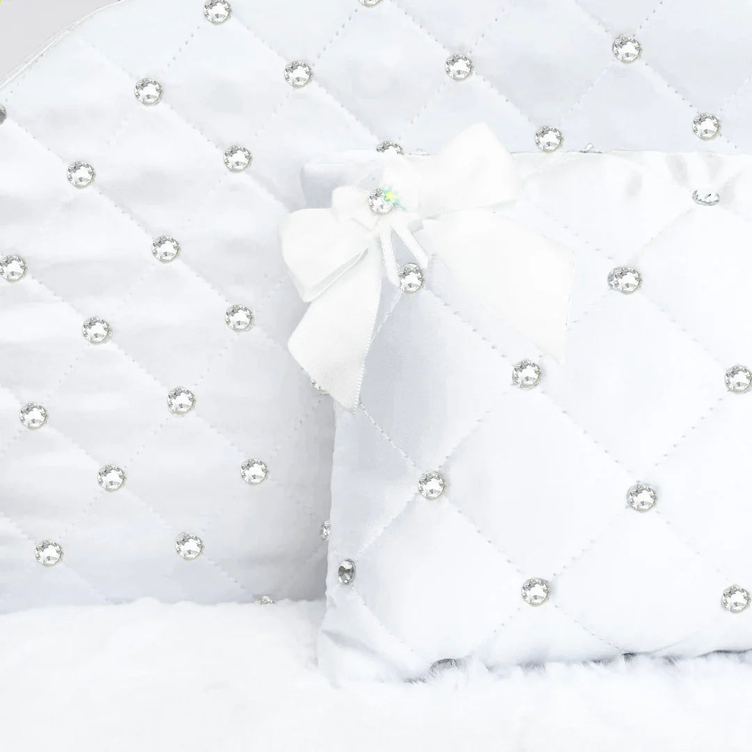 Give your pup the ultimate luxury with the Glamour Baby Bed by Hello Doggie. Handcrafted with diamond-tufted fabric, a plush Bella pillow, and adorned with Swarovski Crystals and a satin bow, this designer dog bed is as stylish as it is comfortable. The non-slip base keeps it secure, while the removable pillow makes cleaning easy. Perfect for small dogs up to 12 lbs, this limited-edition pet bed adds elegance to any home.