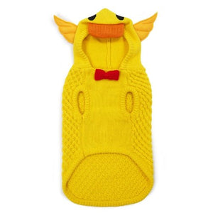 Pullover styled quilted sweater featuring duck accented hoodie and red bow tie