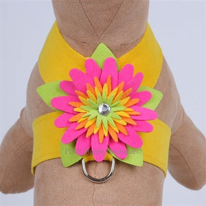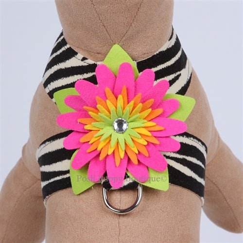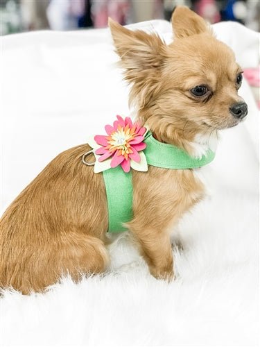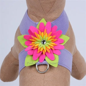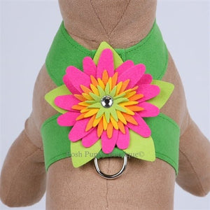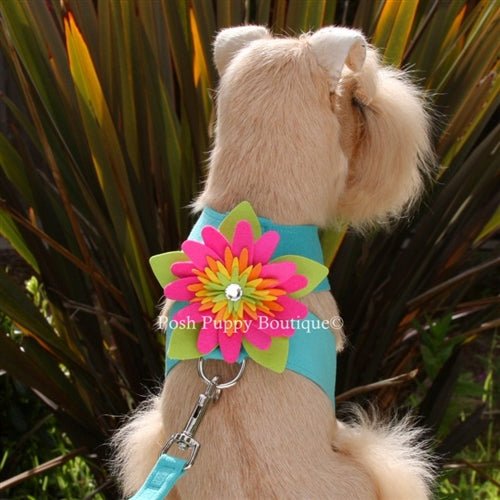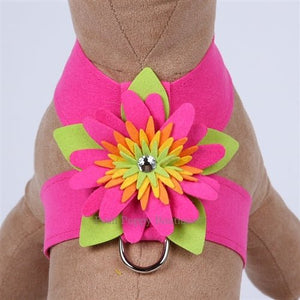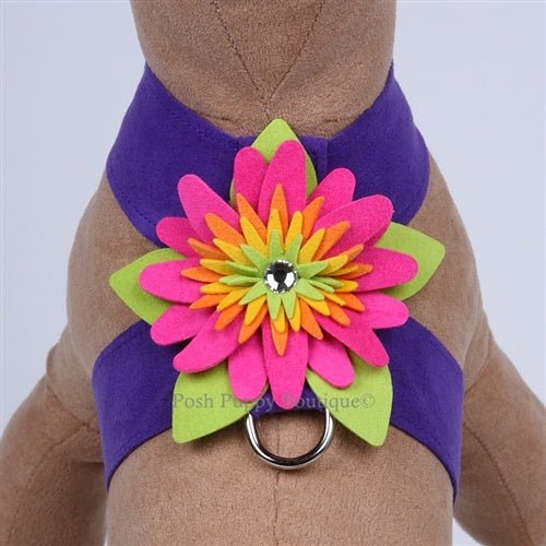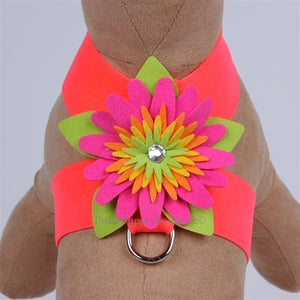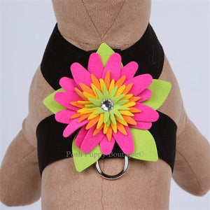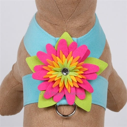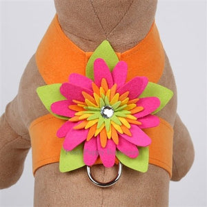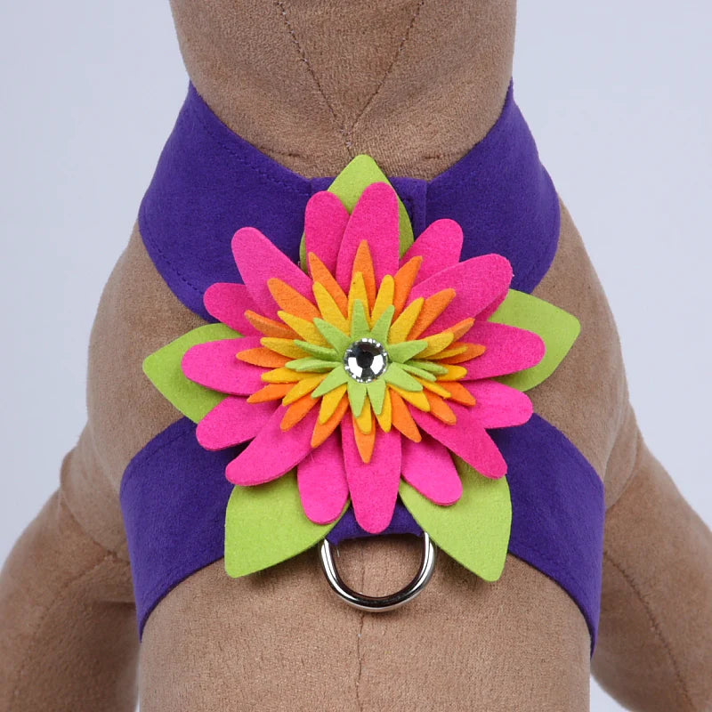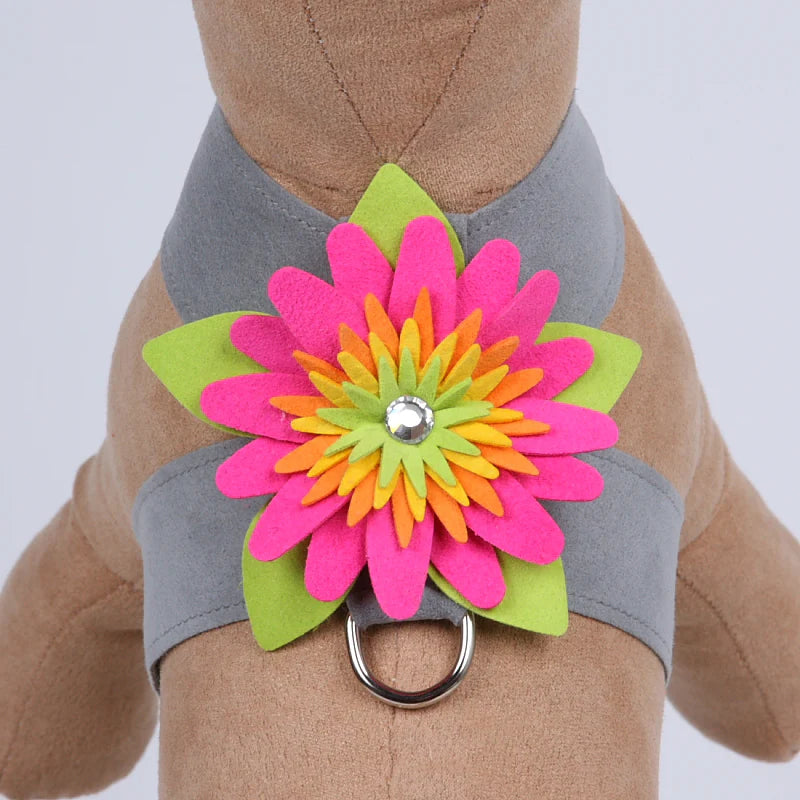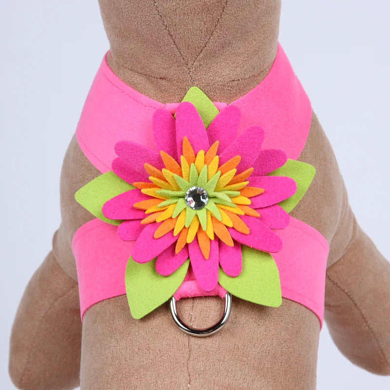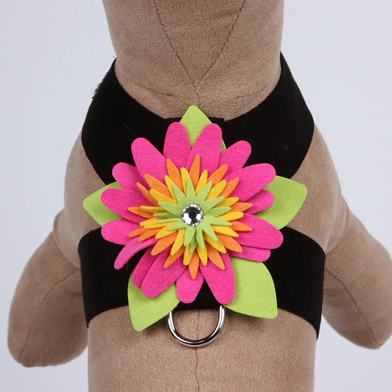 Our Island Flower collection gives you the best of style and plenty of color with Swarovski Crystal.Here is a great harness for those who want a basic, functional harness. Comfortable for the dog, easy for you to maintain and constructed from an indestructible material, this harness is a good value that will last a long time. In addition to that, the fabric gives you a wide range of colors from soft pastels to vibrant hues. Like all of our designs, it is made from genuine commercial upholstery grade Ultrasuede® fabric that we import from Japan. This soft, comfortable fabric is breathable, washable and colorfast. As an assurance to both you and your customer, each item comes with an Ultrasuede® tag with instructions on the back for cleaning and maintenance.