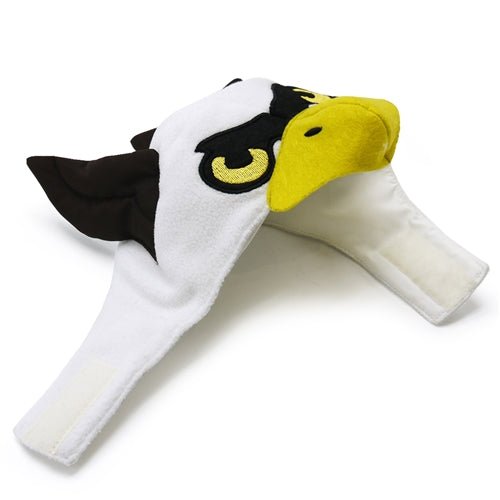 Take off in spirited bald eagle hat detailed with peak, eyes, and wings. Velcro strap closure and adjustment.