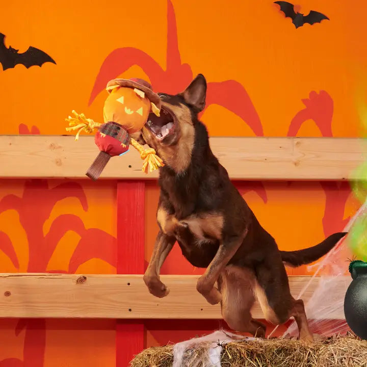 This scarecrow jack-o-lantern dog toy is more than just a pretty face! Jack-Crow-Lantern is a bright, stand-up guy looking for the right pup to scare crows with. His pull-through T-shirt rope, nylon strap, and squeaker are spooktacular assets. Plus, his fluff-filled figure isn't bad to bark at!