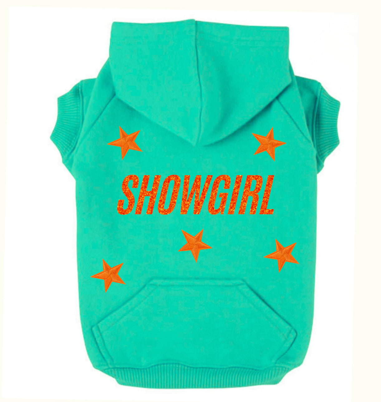 Step into the spotlight with our Star of the Show Hoodie, inspired by Taylor Swift’s Showgirl era. This teal beauty features sparkling orange stars and “Showgirl” across the back — perfect for pups born to shine.