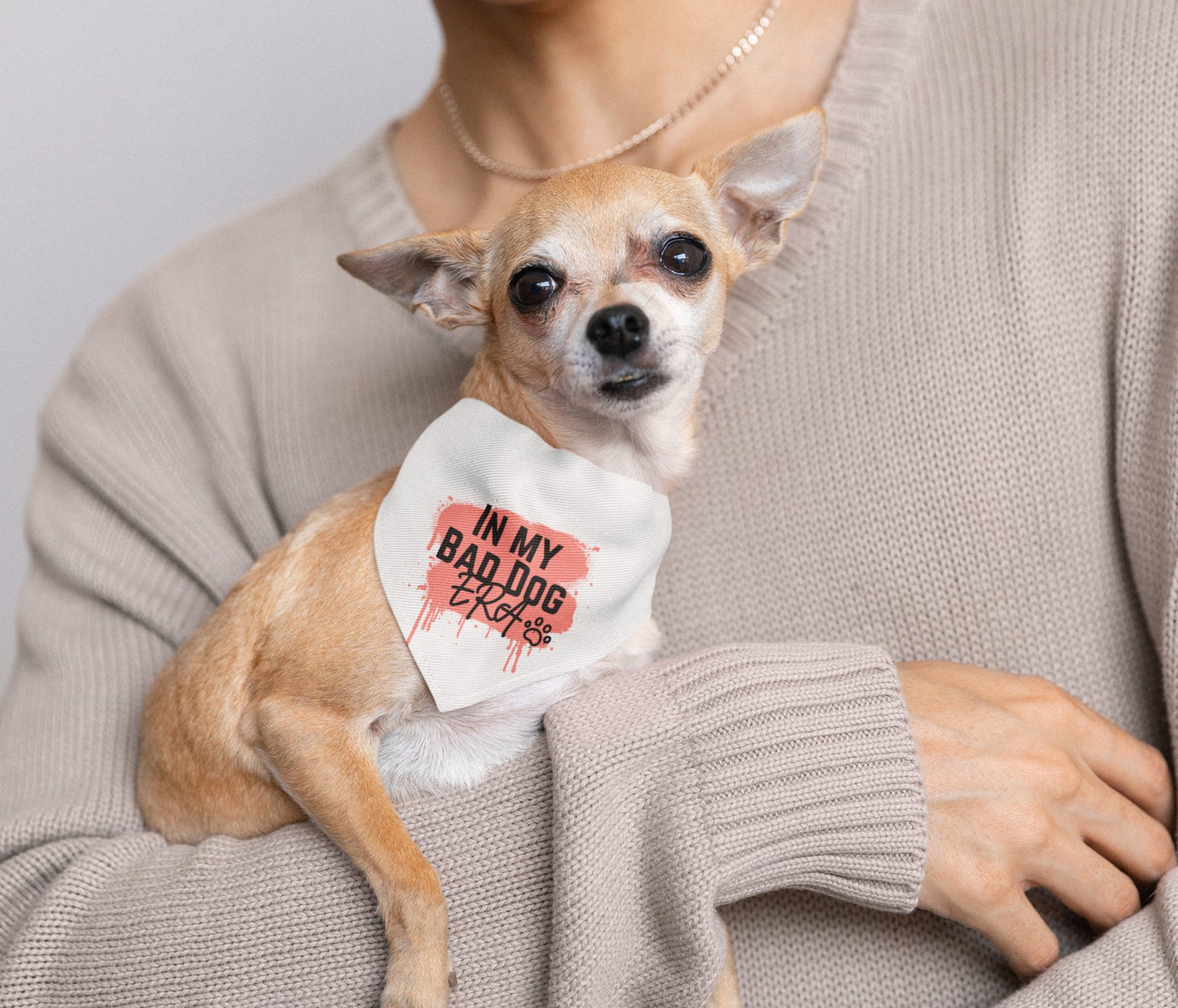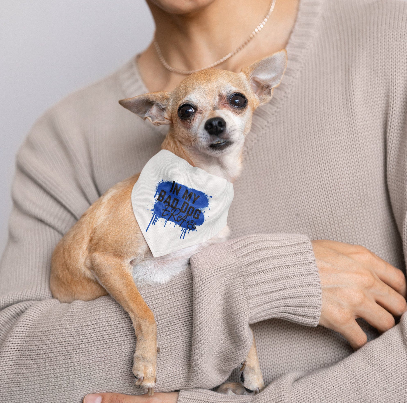 Introducing the "In My Bad Dog Era" pet bandana! This stylish accessory is the perfect way to assert dominance and show who's boss when your pet is wearing it. With its bold design and playful message, this bandana is a fun way to playfully remind others who the new bad dog is in town! Your furry friend will surely make a statement with this unique and eye-catching accessory.
