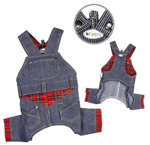 Adorable overall made with striped denim fabric, accented with plaid fabric and crossed V-shaped pockets. Two adjustable lengths on the shoulder straps. A small D-ring attached at the neck area to add on a "Klippo" charm or ID tag! (Each outfit comes with a Klippo logo charm.)