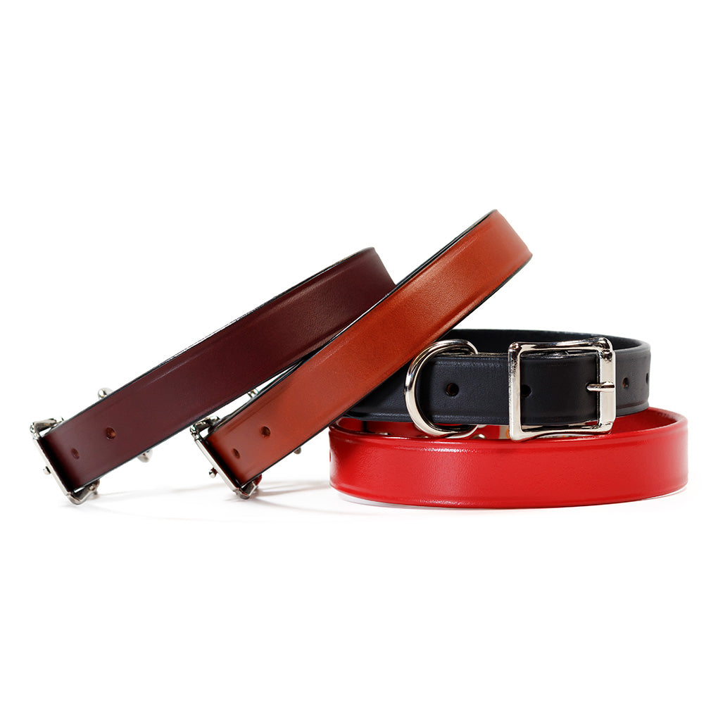 A simple and practical dog collar that still makes a statement, even after more than 70 years. Available in sizes for the smallest puppy to all but the largest dog. This a great starter collar. (In both pink and blue, you can easily identify who’s who in the litter.)