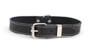 A genuine leather flat collar ornamented with polyester stitching making the collar pop and a tongue of extra leather to protect your pup. It's easier to clip your dog with the lead ring on the back and also great for dog training.