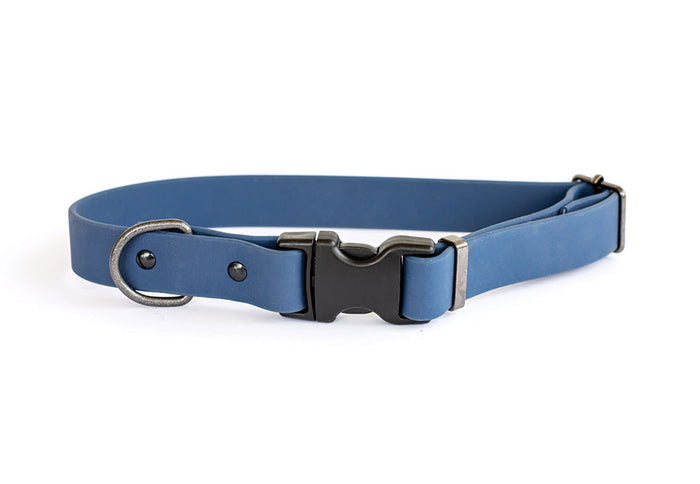 A genuine leather flat collar ornamented with polyester stitching making the collar pop and a tongue of extra leather to protect your pup. It's easier to clip your dog with the lead ring on the back and also great for dog training.