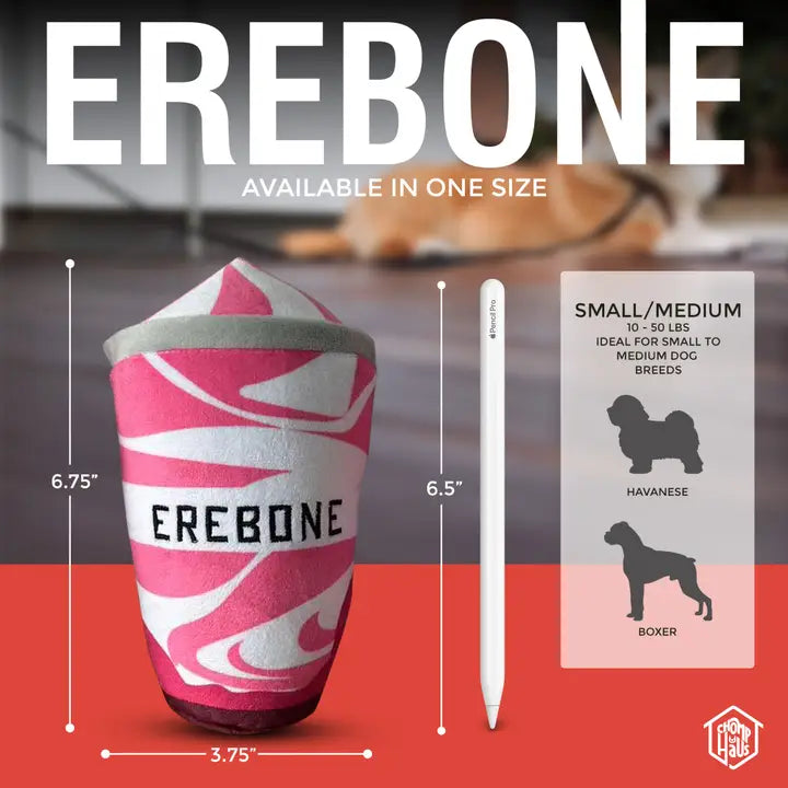The Erebone Pawberry Smoothie is a stylish plush drink parody for small to medium breeds. Made with ultra-soft fabric, embroidery, and a hidden squeaker, it measures 6.75"x3.75" and keeps pups engaged during fetch or solo play. Durable and lightweight, it's a fun, gift-worthy toy that brings luxury and personality to playtime.