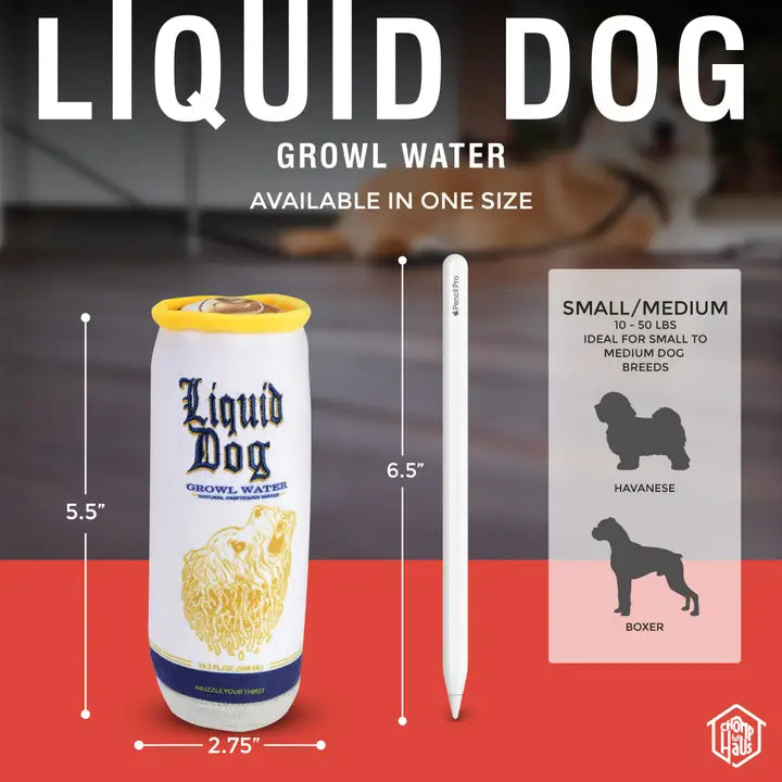A playful parody of a famous beverage brand, this plush water toy brings humor and fun to fetch time. Sized perfectly for small to medium dogs at 5.5"x2.75", it features soft