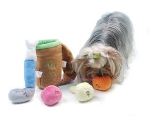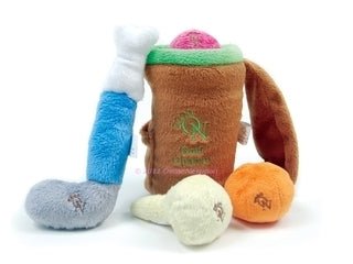 The ultimate toy for the golf lover, this toy set contains two golf balls, a golf tee, and club, all nicely tucked away in a plush soft golf bag embroidered with the ON logo and "Golf Champ." Each toy contains a squeaker and is embroidered with the ON logo.