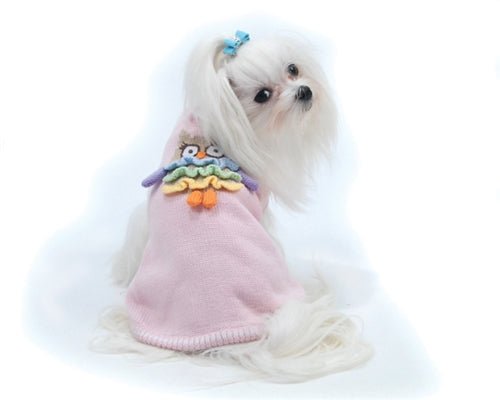 Whose dog doesn’t walk all over us? A charming sweater with a custom owl created with brightly-colored ruffled “feathers” and wings, this sweater is sure to be a favorite this fall and into the cooler seasons. Available in pink for pinkaholics and red for those who love a bolder primary colored look. Knitted in organic cotton.