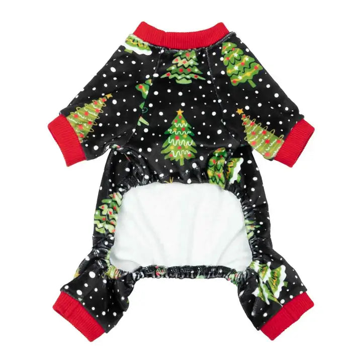 Playful dog Christmas pajamas feature gingerbread men, candy canes, Christmas trees, and Santa motifs on a deep blue background. Bright red cuffs add contrast, creating a cheerful holiday look. Soft four-leg dog onesies keep pets warm and snug during winter lounging, family gathering, or festive photo session. Funny design captures classic Christmas spirit while blending comfort and charm for joyful seasonal moment.