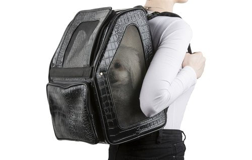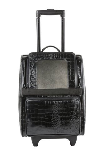 Rio Bag On Wheels Carrier Bag - Black Croco Our best selling Rio Bag on Wheels is now available in stunning black croco embossed faux leather! Travel in style with this chic and sophisticated 3 in 1 rolling pet carrier. The Rio Bag functions as a roller bag, backpack, and even as a car seat for your pet! Very functional and ideal for stress free travel with your pet. Roller bag functions include a retractable two stop handle and detachable roller wheels. Also comes with comfortable backpack straps that also detach. The Rio also allows for maximum ventilation and exposure, interior bedding for extra cushioning and comfort, an interior safety leash for added protection, front compartment with dual pockets for your own accessories, and an additional back pocket for laptop storage!