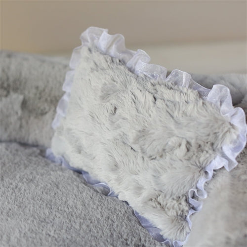 We are excited to debut our new luxurious Divine Bed. Made with only the softest, most luxurious high-end fabric, any pup would dive right into this bed to enjoy a long slumber. The overstuffed pillow allows your pampered pooch to sink into bliss while the low bolster front allows for easy access. The Divine Bed is machine washable in cold water with mild detergent on a delicate cycle, air dry or air fluff with no heat but for best results we recommend dry cleaning.