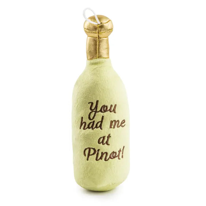 NEW & IMPROVED Santa Muttgarita Pino Grrrigio Sophisticated pups, rejoice! Our Santa Muttgarita Pino Grrrigio is back with a fresh new label and even more charm. This fan-favorite parody of a classic wine now features crackle and squeak for extra playtime appeal, all wrapped in soft, 100% plush polyester. All Haute Diggity Dog toys now feature a durable mesh lining for extra durability! Perfect for the pup who appreciates the finer things in life—no corkscrew required.