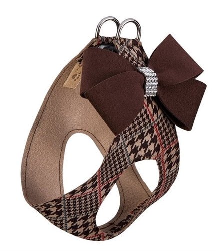 The Chocolate Glen Houndstooth base is the perfect backdrop for our timeless Nouveau Bow, centered with stunning rows of genuine Swarovski Giltmore crystals. Pure & Simple, this Step In Harness is just the product for those who want convenience for them and no-choke comfort for their dog. Fasten by a single quick-release buckle located above the dogs’ shoulders. The cut is well below the dogs’ neck so the pulling is across the shoulders and not the neck resulting in pure comfort for your dog. Easy for you to maintain, this harness is made from genuine commercial upholstery grade Ultrasuede® fabric that we import from Japan