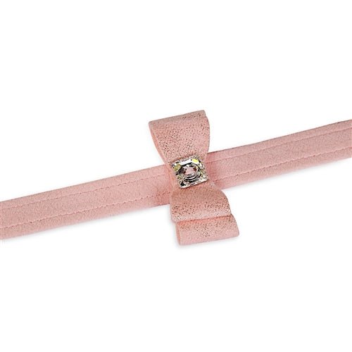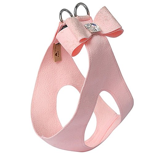 Our new favorite... The Glitzerati Collection! A hint of shimmer adds another level of beauty to the already gorgeous Ultrasuede. This foil like effect is embedded into the Ultrasuede so that none of this glitz will rub off or wash out. Just like our solid Ultrasuede's, use after use, wash after wash, this timeless fabric will maintain it's beauty. Also known as the Pure & Simple, this harness fastens by a single quick-release buckle located above the dogs’ shoulders and is cut well below the dogs’ neck so the pulling is across the shoulders and not the neck. The end result is pure comfort for the dog. Easy for you to maintain, this harness, including the Glitzerati Nouveau Bow centered with Swarovski Crystals, is made from genuine commercial upholstery grade Ultrasuede® fabric that we import from Japan. This soft, comfortable fabric is breathable, washable and colorfast. As an assurance to both you and your customer, each item comes with an Ultrasuede® tag with instructions on the back for cleaning and maintenance. Manufactured in the USA