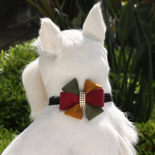 Rich colors of Burgundy, Olive and Bronze fan out for a display of warm and inviting curves with 3 rows of genuine Swarovski crystals in the center. Like all of our designs, it is made from genuine commercial upholstery grade Ultrasuede® fabric that we import from Japan. This soft, comfortable fabric is breathable, washable and colorfast. This 1/2 inch collar is manufactured in the USA. We recommend your dog should always be walked with a harness. Our collars are designed for ID tags, charms and for decoration. They are not designed for pulling dogs.