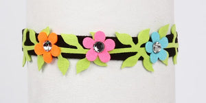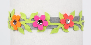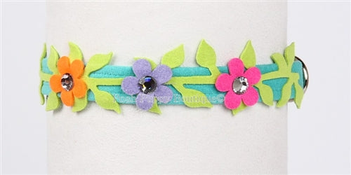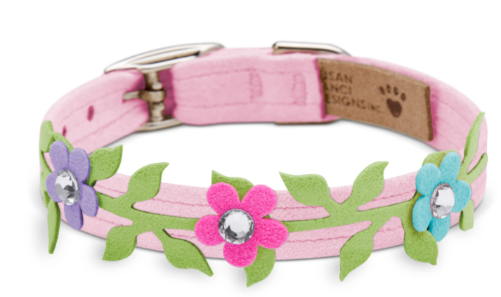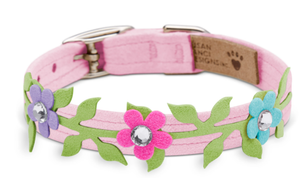 We created the Secret Garden Collar for the lovely and lively alike. Comfortable for your dog, easy for you to maintain. And like all of our designs, made from genuine commercial upholstery grade Ultrasuede® fabric that we import from Japan. This soft, comfortable fabric is breathable, washable and colorfast. This collar is manufactured in the USA. We recommend your dog should always be walked with a harness. Our collars are designed for ID tags, charms and for decoration. They are not designed for pulling dogs.