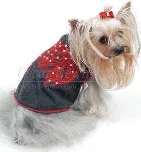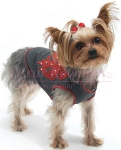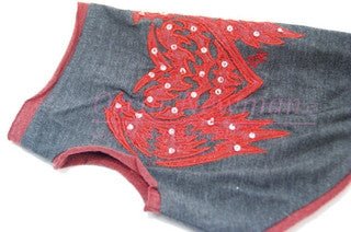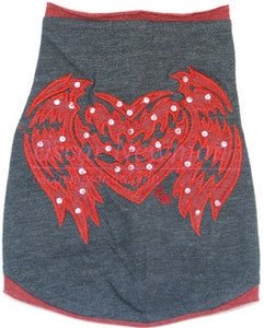 Heart Breaker TeeThis heather grey cotton tee features red rolled trim on the neck, armholes, and hem, and a coordinating red heart-with-wings applique, each painstakingly custom hand-cut for all five sizes. The appliques are embroidered, stitched, and embellished with sequins and ON logo embroidered in red. Perfect for the rocker pup in your life!