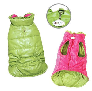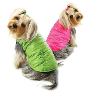 Adorable and reversible lightweight puffer vest accented with ruffle trims on the collar and fake pockets (lime color side only). With a convenient harness opening for easy leash attachment.