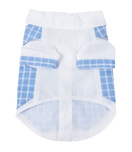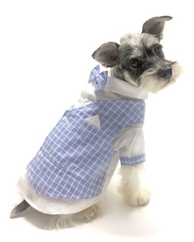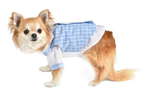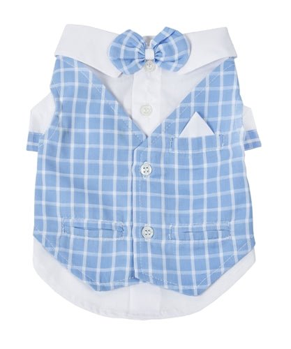 Special occasions call for the perfect outfit, and this charming tux is perfect for the holidays or anytime your little boy wants to turn heads! Adorable bow tie, real buttons, a tiny hankie and tiny pockets, this is a must-have for the little gentleman in your life. In baby blue plaid, this adorable outfit is sure to put your pup on the top of the most fashion-forward list!