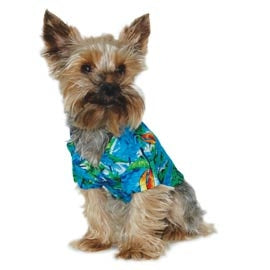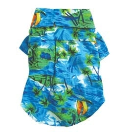 Don't forget this shirt before heading to the beaches! Light cotton button up shirt with one of a kind tropical island pattern. Leash hole right below collar