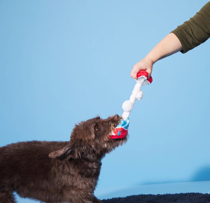 This BARK ice cream carton dog toy puts boredom in a deep freeze with its large squeaker, crazy crinkle and super stretch bungee for tugging and pulling. Hide some treats in the Poopies N' Cream carton and watch your pup dig in!