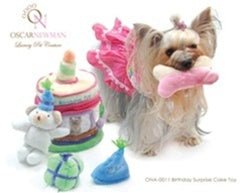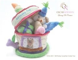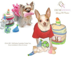 The ultimate birthday toy for the luckiest of birthday pups, this Birthday Surprise Cake toy with loads of details is actually 5 toys in 1! The plush birthday cake zips open and out pops 4 tiny squeaky toys: a squeaky bone, an adorable teeny teddy bear wearing a birthday party hat, a squeaky birthday present, and a cr...inkly birthday party hat with a paw embroidered detail. The birthday cake features an embroidered Birthday Pup above a clear plastic window frame to insert your babys photo, a plush birthday candle, a plush bone on the zipper, and crinkly zip-up lid. Whether you give it or receive it, this Birthday Surprise Cake toy will be the most coveted gift during a birthday pup bash! Made to order. 1-2 week lead time