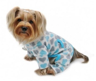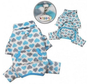 Light blue and gray heart prints all over this soft fleece pajamas. Extended collar can be worn as a turtleneck or folded down.