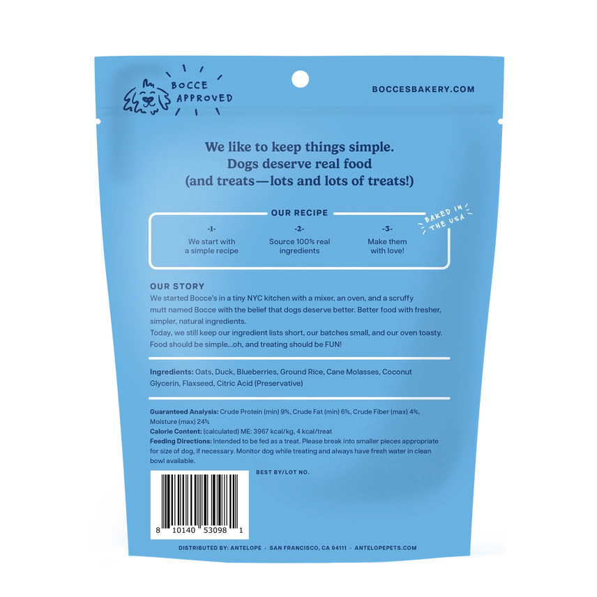 Ingredients: Oat Flour, Duck, Blueberries, Ground Rice, Ground Oats, Cane Molasses, Coconut Glycerin, Flaxseed, Citric Acid (Preservative) Guaranteed Analysis: Crude Protein (min) 9%, Crude Fat (min) 6%, Crude Fiber (max) 4%, Moisture (max) 24% Calories: 4 per treat