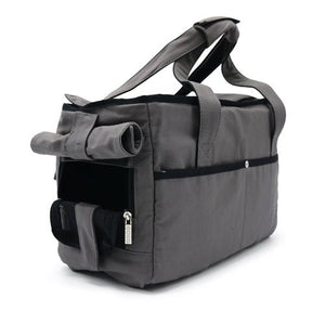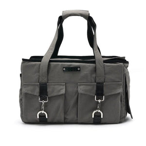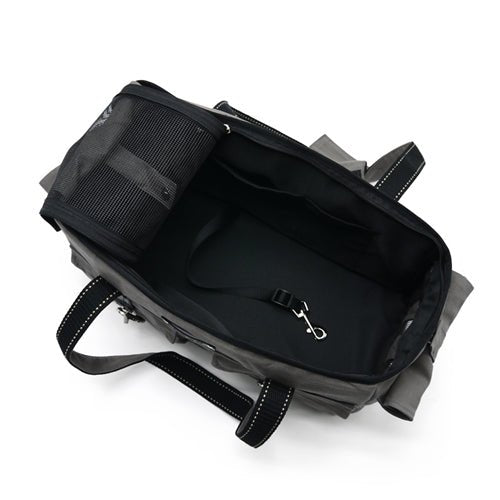 Modern soft canvas collapsible tote with dual strap design, functional pockets outside with clasp metal hardware, inner compartmental pockets, zipper mesh window with cover over top, rolled up cover on the side and an inner security leash.
