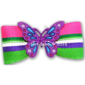 Tailored grosgrain ribbon with pink, green and purple stripes with a purple colorful butterfly center. Stiffened for extended wear; approx 1.75" wide; ribbon 7/8" wide