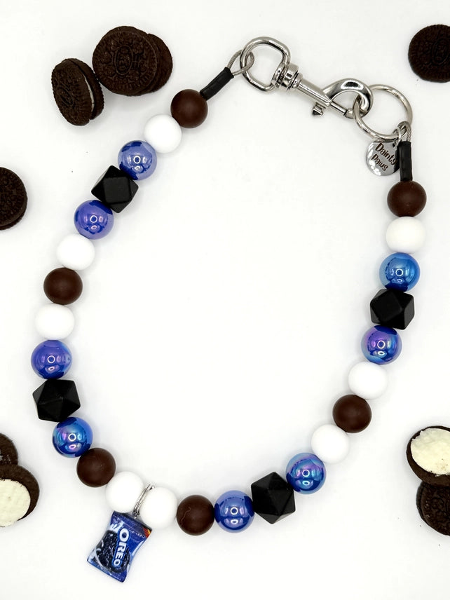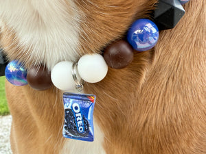 Choco-lovers, this one’s for you! Inspired by your favorite midnight snack, Milk & Mischief beaded dog collar brings together creamy whites, deep browns, and cookie-cool blues for a collar that’s sweet, sleek, and full of attitude. Handcrafted features include: BPA-free 15mm silicone beads 16mm Acrylic Beads Lead, phthalate and cadmium free Stainless steel swivel lock and "O" ring on collars Collars made with vinyl-coated aircraft wire Resin Candy Charm
