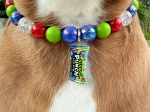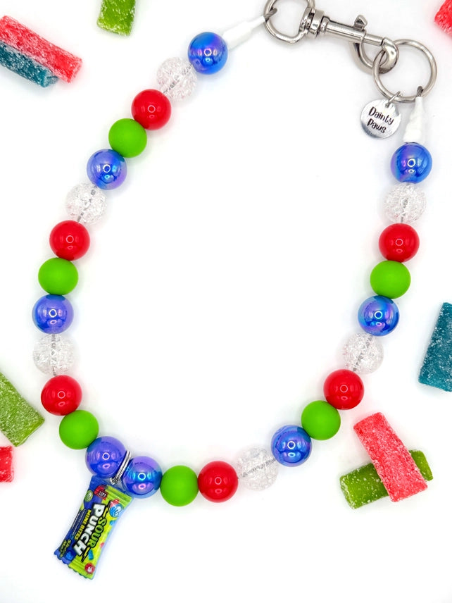 Tart, zesty, and totally bold — Pucker Up Pup beaded dog collar is for the pups who live life with a little zing! A vibrant mix of electric blues, juicy reds, sour green, and crystal-clear sparkle. Handcrafted features include: BPA-free 15mm silicone beads 16mm Acrylic Beads Lead, phthalate and cadmium free Stainless steel swivel lock and "O" ring on collars Collars made with vinyl-coated aircraft wire  Resin Candy Charm