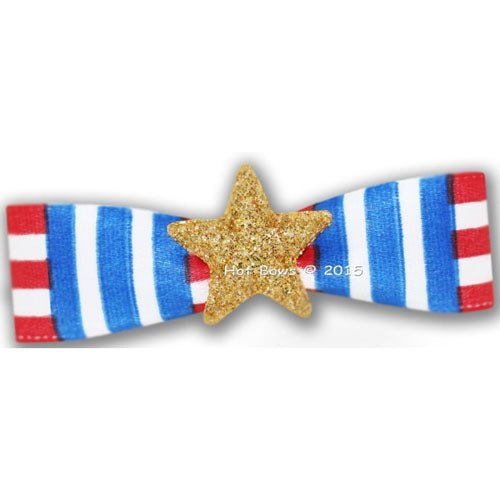 A glittered gold star on this great narrow red, white and blue ribbon. You will look like the captain of your ship in this Hot Bows. Stiffened for extended wear; approximately 2” wide; ribbon 5/8”