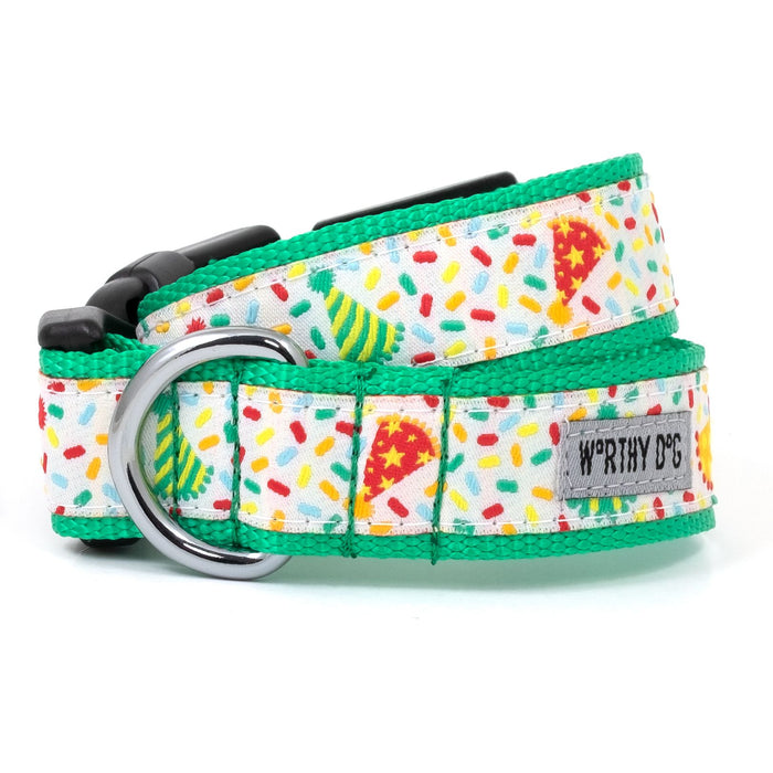 Adjustable collars focused on durability and style, featuring woven ribbon sewn onto comfortable and strong nylon webbing with snap clasp and nickel-plated hardware.