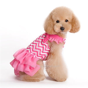 Chevron patterned dress with layered ruffled skirt and ruffled shoulder straps accented with two bows. Leash hole.