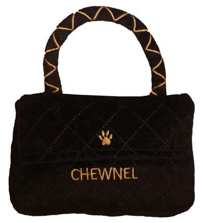 A Handbag every woman wants is now the toy every dog needs. Plush exterior with a squeaker that drives dogs cray. Every Pampered Pooch should have. Match with our Chewnel Champagne toy!